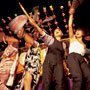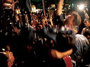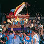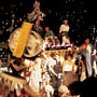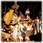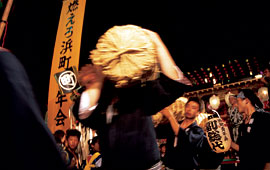 ◇3日間町内を巡行した全町内の屋台が八坂神社へ集まり、屋台に積んだ御饌米の俵を若者たちが担いで奉納する。