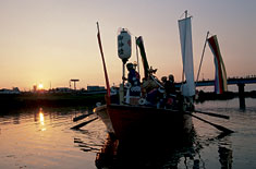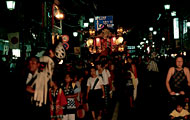 「上越まつり」は高田・直江津両地区協同の祇園祭です。高田地区で3日間の祇園祭の後、御輿が舟で関川を下り、祇園は直江津地区へ。19町内の屋台が直江津地区を巡行、最終日の夜は屋台が八坂神社に集まり、若者が屋台に積んだ米俵を担ぎ八坂神社に奉納する「御饌米奉納」が行われます。