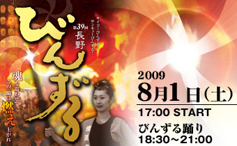 「長野びんずる」は、長野市の夏の最大イベント。「市民総和楽・総参加」の精神のもと、踊り手から見物客まで市民みんなが盛り上がる夏の風物詩です。かがり火の下、繰り広げられるびんずる踊りの輪が「ソーレ」のかけ声、しゃもじを打つ音とともに市内に響き渡ります。