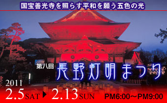 今回で8回目を数える長野灯明まつりは、長野オリンピックの開催を記念し、2004年から始まったお祭りです。オリンピックの「平和を願う精神」を後世に遺してゆくため、世界に向けて「平和の灯り」を力強く発信しています。「善光寺・五色のライトアップ」や善光寺参道に平和への想いが込められた光りのアートが並ぶ「ゆめ灯り絵展」等、大小様々な光りを灯して、世界の平和を祈ります。 |