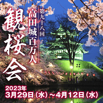 高田城址公園では、公園とその周辺を含めて約4,000本の桜の開花にあわせて観桜会が催されます。三重櫓と桜が約3,000個のぼんぼりの明かりに映え、お堀の水面にうつる様は「日本三大夜桜」の一つに数えられます。 |